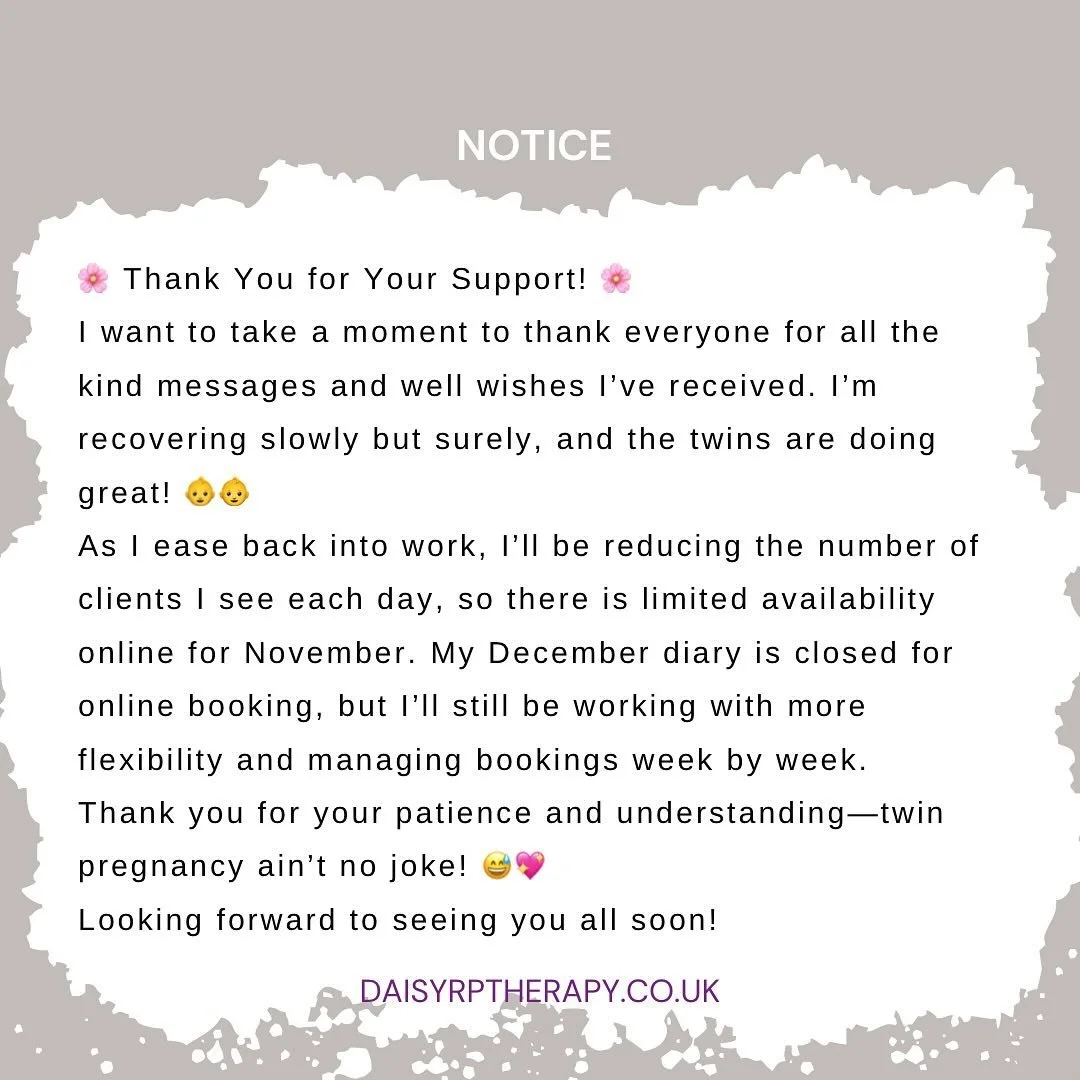 I am currently on maternity leave and excited to be returning! I will be returning to work in March and will be working through a waiting list for appointments. If youβd like to secure a spot, please contact me to join the waiting list. Iβm looking forward to seeing you again and helping you feel your best! Thank you for your continued support.